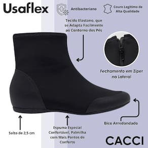 Essa bota Usaflex é a escolha ideal para quem busca aquecimento, conforto e funcionalidade em uma única peça. Desenvolvida com tecido elástico que se adapta ao formato dos pés, ela proporciona um encaixe suave e ergonômico, valorizando o movimento natural ao caminhar. O cabedal conta com acabamento em material de alta qualidade e propriedades antibacterianas, o que ajuda a evitar odores, reduz a presença de micro-organismos e contribui para um uso mais higiênico e saudável, mesmo em longos períodos de uso. A palmilha interna possui espuma especial que distribui os pontos de apoio de forma equilibrada, garantindo leveza e bem-estar durante toda a caminhada. O salto de 2,5 cm oferece estabilidade e conforto ao mesmo tempo, promovendo uma leve elevação que contribui para a postura e o alinhamento do corpo. O fechamento lateral é prático, permitindo calce rápido sem esforço e assegurando firmeza ao longo do dia. Seu design com bico arredondado proporciona ainda mais conforto para os dedos, tornando essa bota ideal para quem não abre mão de um encaixe macio e anatômico. Versátil e discreta, ela combina com diversos tipos de roupa e pode ser usada em passeios, viagens, compromissos casuais, ambientes climatizados ou para enfrentar dias frios com elegância. Também é uma ótima opção para quem busca conforto térmico e liberdade de movimento, seja em rotinas urbanas ou momentos de lazer. É um modelo funcional, estiloso e pensado para acompanhar com leveza todos os seus passos, do trabalho ao descanso.