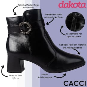 Com cano de 14 cm de altura e circunferência de 27 cm, ela se ajusta perfeitamente ao tornozelo, valorizando a silhueta e combinando com os mais diversos estilos. Do look casual com jeans à produção mais refinada com vestidos ou saias, a Bota Dakota se adapta ao seu ritmo, à sua rotina e à sua essência.
