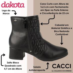 Perfeita para o dia a dia e para momentos de lazer, a bota Dakota é confeccionada em material sintético macio e resistente, garantindo conforto e durabilidade. O cano curto com altura de 16,5 cm e circunferência de  23 cm garante estilo e praticidade, enquanto o salto bloco de 4,7 cm proporciona estabilidade e segurança para você curtir seus momentos com tranquilidade. O fechamento de ecler na lateral externa do cano facilita o calce e garante um ajuste perfeito.