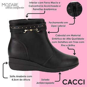 Outro ponto que conquista logo de cara é a praticidade no uso. O fechamento lateral facilita o calce e o ajuste ao pé, enquanto o solado com ótima aderência oferece mais confiança ao caminhar em diferentes tipos de solo. O cano curto se adapta bem ao tornozelo, proporcionando liberdade de movimentos e combinando perfeitamente com calças, vestidos ou saias. Essa é a bota ideal para quem quer unir estilo, funcionalidade e aquele cuidado especial com os pés em um único calçado. Escolha Modare e sinta a diferença em cada detalhe.