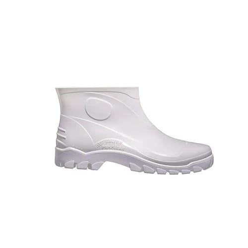 • Calçado ocupacional tipo bota, confeccionado em PVC injetado na cor branca, impermeável, solado antiderrapante na cor branca, acabamento interno com meia de poliéster na cor branca.
