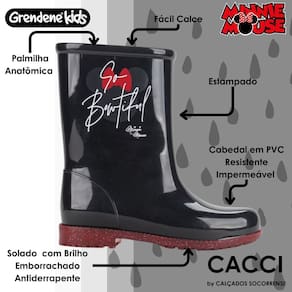 Dê um passinho mágico na chuva com as novas galochas da Minnie. Esta galocha encantadora traz um toque de brilho com sua sola translúcida e reluzente, perfeita para brincar sob a chuva ou pular em poças. O cabedal é adornado com uma serigrafia vibrante, destacando a adorável silhueta da Minnie em tons alegres e femininos. Cada par é uma verdadeira fantasia dos personagens, com grafias personalizadas que contam histórias encantadoras. A capa vem fechamentos em botão de pressão no pescoço e nas mangas, é fácil vestir e sair para se divertir, mesmo nos dias chuvosos!