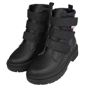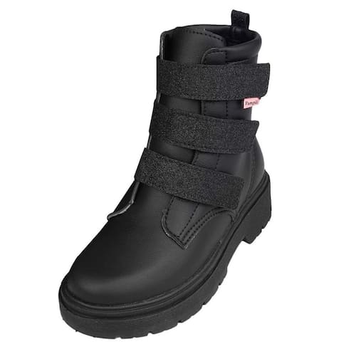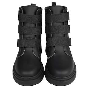 Bota coturno feminina cano médio em material sintético com recortes de glitter no tira autocolante e na parte traseira, moderna e descolada! Forrado em tecido que auxilia na absorção do suor.