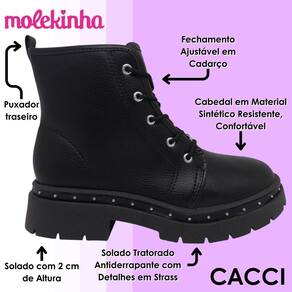 O coturno Molekinha é aquele modelo que une atitude e delicadeza na medida certa, ideal para as meninas que gostam de um visual marcante sem abrir mão do charme. Com um design robusto e detalhes encantadores, ele é perfeito para completar os looks com muito estilo e segurança em qualquer ocasião.