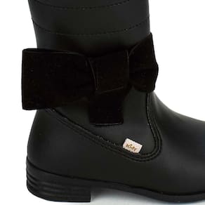 Bota Kidy Menina Preto Ref:036.0037.. Bota Infantil estilo Montaria para esquentar e proteger os pezinhos nos dias mais frios.. Com cano um pouco mais alto foi desenvolvida com materiais de alta qualidade, bem flexíveis e macios para trazer todo cuidado e conforto que as meninas precisam na fase dos Primeiros Passos.. Possui enfeite de laço em material camurça que traz um ar mais delicado e sofisticado, perfeita para compor os looks mais moderninhos dos dias de inverno.. A sola em TR antiderrapante apresenta maior aderência e estabilidade nas pisadas garantindo segurança para brincar, correr e se divertir..