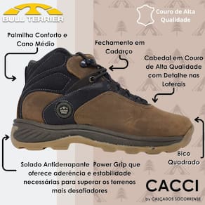 A Bota Bull Terrier Explorer Castanho é a parceira ideal para quem ama trilhas, caminhadas em terrenos desafiadores e até mesmo para quem curte um visual aventureiro no dia a dia. Com um design robusto e cheio de personalidade, ela combina resistência, segurança e aquele toque de conforto que faz toda a diferença em longas jornadas.