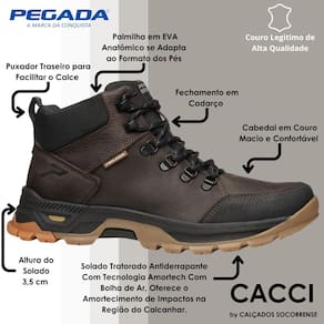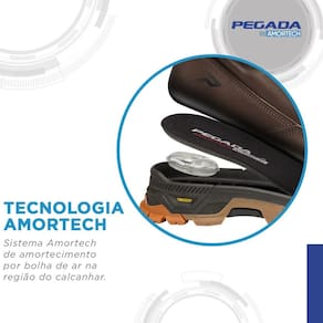 O fechamento em cadarço permite um ajuste firme e seguro, enquanto o puxador traseiro facilita o calce, oferecendo praticidade desde o primeiro uso. A palmilha anatômica em EVA se molda ao formato dos pés, proporcionando conforto prolongado, mesmo após horas de uso. Já o solado é tratado e emborrachado, com três vírgula cinco centímetros de altura e tecnologia Amortech com bolha de ar, responsável por amortecer os impactos na região do calcanhar e garantir estabilidade em diversos tipos de terreno.