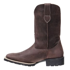 Bota masculina Cow Way fabricada em couro na cor Café, possui cano alto, bico quadrado com florão costurado no peito do pé, vira com costura dupla e solado de borracha.