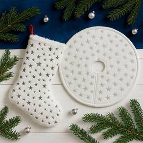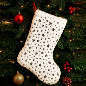 Bota Meia Saia Decoração Estrelinhas árvore Natal Pelúciado Bota Meia Saia Decoração Estrelinhas Árvore Natal Pelúciado - Transforme sua decoração de Natal com este conjunto elegante e super delicado. Produzidos em material peluciado branco com detalhes Prateado em alto brilho, estes itens trazem sofisticação, aconchego e muito charme para sua árvore Características da Saia: Material: Pelúcia macia e espessa Cor: Branco com Estrelas Prata metalizados Tamanho: Aproximadamente 60cm Características da Bota/Meia: Material: Pelúcia + detalhes dourados Tamanho: Aproximadamente 32cm Estampa combinando com a saia Ideal para pendurar em árvores, portas, lareiras ou compor kits decorativos Acabamento reforçado Embalagem: 1x Bota/Meia Peluciada de 32cm 1x Saia Peluciada de 60cm