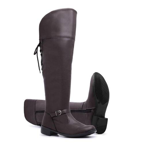 Bota Over Moda Chic Com Amarração e Fecho de Zíper Bico Redondo E Salto Grosso - 39 - Marrom