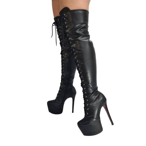 Bota Over The Knee Paola.Marca: Dom&AmazonaBota feminina de salto super alto e meia pata alta com cano que passa acima do joelho, possui cadarço até em cima que é ajustavel e também ziper lateral para um calce fácil. Essa é uma bota que chama a atenção com toda certeza, não tem nada de básica, poderosa e deixará seu look fabuloso.Por estar disponivel do 33 ao 43 as alturas de salto mudam um pouco, por exemplo:No tamanho 35 tem 15cm de salto e meia pata de 5cm.No tamanho 41 tem 17cm de salto e meia pata de 6cm.Ou seja muda um pouco para mais ou para menos de acordo com o tamanho.Qualquer dúvida pelo campo de perguntas que estaremos a disposição.Bota feminina overtheknee numeração especial grande.Moda fashion, moda drag, moda inclusiva, moda feminina, empoderamento feminino.Bota Paola Dom&Amazona