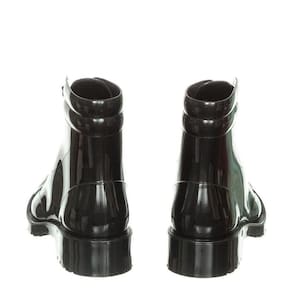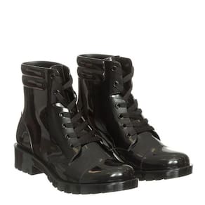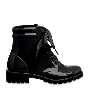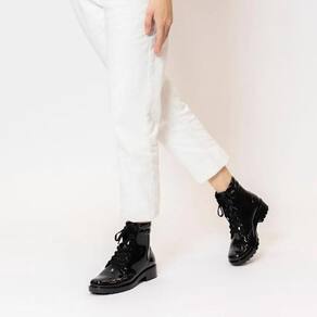 Bota estilo coturno em preto. Feita em J-Lastic, possui detalhe acolchoado na parte traseira e detalhe no calcanhar. Conta com atacadores da mesma cor. Com solado tratorado e salto baixo.