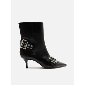 Descrição: Bota feminina preta com acabamento brilhoso. O sapato tem cano curto, salto baixo fino e ponta fina. Traz cabedal ajustado ao pé e fecho em zíper na lateral interna do cano. Possui tiras largas sobre o cabedal e na parte traseira do cano, ambas com ilhós e fivelas metálicas grandes. Referência: A1275700870001