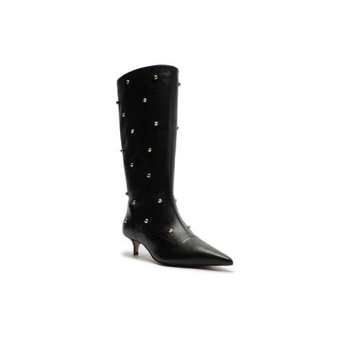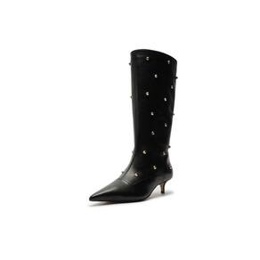 Descrição: Bota feminina preta de couro. O modelo tem cano médio, salto baixo fino e bico fino. Traz bordado western no cabedal e cano. Referência: A1323500180001