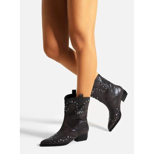 Descrição: Bota feminina preta em couro desgastado. O modelo tem cano curto, salto baixo bloco em fachete e bico fino. Traz aplicações em couro e rebites metálicos no cabedal e cano. Não possui fechamento. Com tira como puxador na lateral do cano, facilitando o calce. Referência: A1276100170001