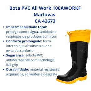 Adquira já sua bota PVC cano alto com forro e polaina All Work 100AWORKF Marluvas CA 42673 e garanta impermeabilidade, conforto e segurança em suas atividades!