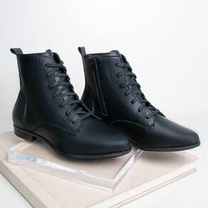 Palavras-chave: Bota rasteira, zíper lateral, cadarço ajustável, conforto, estilo, moda feminina, sofisticação, versatilidade, cano médio, cores neutras, calçado feminino.