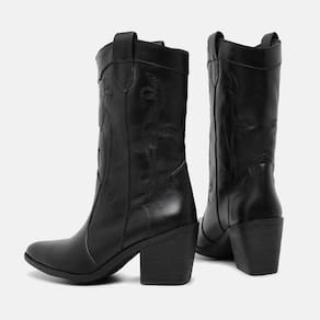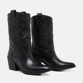 A bota tem um design moderno e minimalista inspirado no estilo western. O cano médio tem um corte limpo, sem muitos detalhes decorativos aparentes, o que dá à bota uma aparência mais sofisticada e contemporânea. O bico é levemente pontudo, seguindo a estética tradicional das botas western, mas com um toque mais fino e elegante. O salto é grosso, criando um contraste interessante com o corpo da bota, além de oferecer estabilidade e conforto ao usuário. A simplicidade no design dessa bota faz dela uma peça versátil, que pode ser usada tanto em ocasiões casuais quanto em combinações mais estilizadas, mantendo uma pegada clássica, porém moderna.