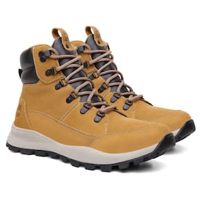 Bota Masculina Amarelo Adventure Trekking Solado Tratorado Casual para Trilhas, Caminhadas, Passeios feito em Couro na Cor Mostarda Reforçado Moderno, Resistente, Elegante, Confortável - Modelo Edição Limitada Novo Lançamento 2023 Estiloso com Fechamento em Cadarços