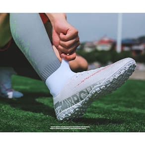 Alta parte superior sintética de alto desempenho combinada com gola têxtil proporciona um ajuste leve, é uma boa opção de sapato de futebol A gola de alto ajuste cria um ajuste seguro e de apoio e protege o tornozelo Sourada na parte superior para durabilidade, sola externa Borracha antiderrapante com alta aderência Equipe de trabalho profissional com boa tecnologia de acabamento de produção Amplos usos: treinadores de futebol, competição, caminhadas, corrida, é adequado para grama l, jogos de borracha, grama artificial e solo firme, solo duro, etc. .