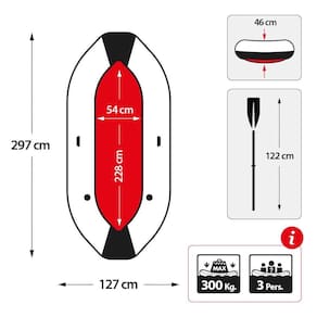 - Dimensões: (Bote 298 x 127 x 46 cm) (Capota 1.6 x 1.42 m);