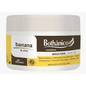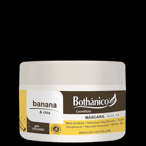Máscara 250g banana e chia - bothânico hair a linha banana e chia – bothânico hair, foi especialmente desenvolvida para você que busca ter cabelos hidratados e disciplinados. sua fórmula contém combinação incrível de banana e chia. a banana é riquíssima em minerais e vitaminas e a semente da chia, potente em polissacarídeos, possui alta capacidade de retenção da água e formação de filme, auxiliando na redução do frizz e do volume. a máscara de hidratação banana e chia, de textura cremosa e fragrância irresistível, promove um cuidado intensivo para os cabelos. com alta concentração de ativos emolientes e nutritivos, promove hidratação, maciez, brilho e redução de volume. indicação: para todos os tipos de cabelo modo de usar: após lavar cabelo com shampoo banana e chia, aplique a máscara nos cabelos ainda úmidos, massageando suavemente, mecha a mecha. deixe agir de 10 a 15 minutos. enxague bem o produto. em seguida aplique o condicionador banana e chia e enxague. benefícios: - efeito antifrizz- hidratação equilibrada- ação disciplinante- nutrição avançada- brilho 3d embalagem: 250g