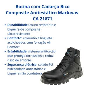 Botina com Cadarço Bico Composite Antiestático Marluvas CA 21671 Proteção e Conforto em Ambientes Elétricos A Botina da linha Composite Marluvas é confeccionada em couro de alta resistência, sem componentes metálicos, garantindo segurança mecânica e antiestática. Seu fechamento em cadarço, colarinho e lingueta soft acolchoados e solado isolante em PU bidensidade oferecem conforto e desempenho em atividades que exigem proteção contra perfurações e riscos elétricos.
