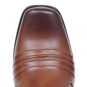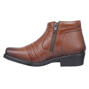 Botina masculina Zebu fabricada em couro na cor Marrom, possui cano curto com zíperes laterais, bico quadrado com detalhes no peito do pé e solado de borracha.