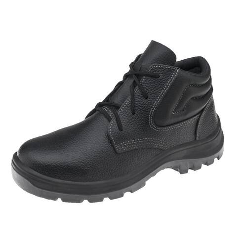 Botina de segurança confeccionada em vaqueta, com biqueira de PVC, almofada lateral, solado bidensidade em poliuretano (PU) injetado diretamente no cabedal.