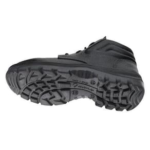Botina de segurança confeccionada em vaqueta, com biqueira de PVC, almofada lateral, solado bidensidade em poliuretano (PU) injetado diretamente no cabedal.