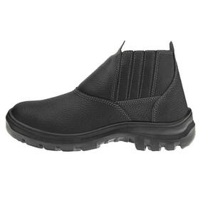 Botina de segurança confeccionada em vaqueta, com biqueira de PVC, almofada lateral, solado bi densidade em poliuretano (PU) injetado diretamente no cabedal.