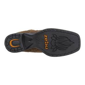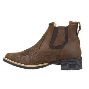 Uma Botina modelo Feminina da marca Zebu, esta fabricada em couro trabalhado na cor Terra, possui cano curto com elásticos laterais, bico quadrado, vira duplamente costurada e solado de borracha detalhado.