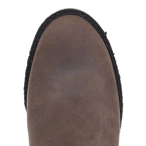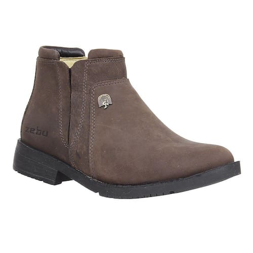 Botina feminina Zebu fabricada em couro na cor Marrom, possui cano curto com elásticos laterais, bico redondo e solado de borracha
