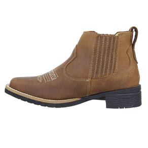 Botina feminina Zebu fabricada em couro na cor Marrom, possui cano curto com elásticos laterais, bico quadrado com florão costurado no peito do pé, vira costurada e solado de borracha.