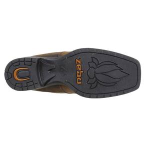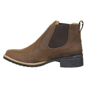 Uma Botina Feminina da marca Zebu, fabricada em couro de alta qualidade destacando a textura única do couro, possui cano curto com elástico lateral acolchoado no interior, bico quadrado, vira costurada e solado de borracha tratorado.