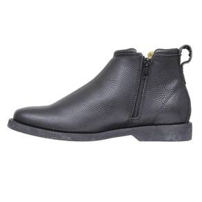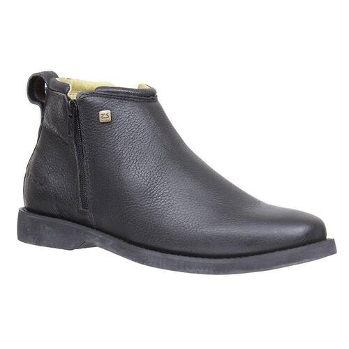 Botina masculina Zebu fabricada em couro na cor Preta, possui cano curto com zíperes laterais, bico redondo, vira costurada e solado de borracha.