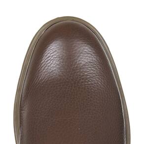 Uma Botina modelo Masculino da marca Zebu, esta fabricada em couro na cor Pinhão, possui cano curto com elásticos laterais, bico redondo, vira colada e solado de borracha detalhado.