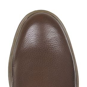 Uma Botina modelo Masculino da marca Zebu, esta fabricada em couro na cor Pinhão, possui cano curto com elásticos laterais, bico redondo, vira colada e solado de borracha detalhado.