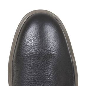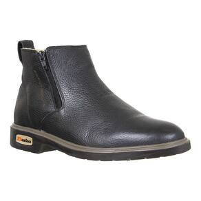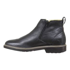 Uma Botina modelo Masculino da marca Zebu, esta fabricada em couro na cor Preto, possui cano curto com zíperes laterais, bico redondo, vira colada e solado de borracha detalhado.