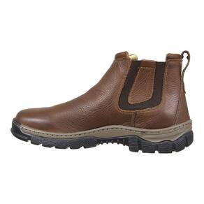 Uma Botina modelo Masculino da marca Zebu, esta fabricada em couro na cor Whisky, possui cano curto com elásticos laterais, bico redondo, vira colada e solado de borracha tratorado.