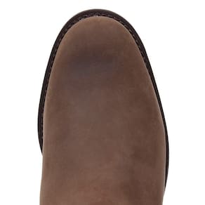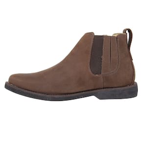 Botina masculina Zebu fabricada em couro na cor Marrom, possui cano curto com elásticos laterais e zíper, bico redondo, vira costurada e solado de borracha