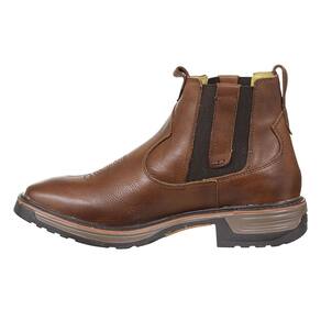 Uma Botina modelo Masculino da marca Zebu, fabricada em couro de alta qualidade destacando a textura única do couro, possui cano curto com elásticos laterais acolchoado no interior, bico quadrado com florão costurado no peito do pé, vira colada e solado de borracha tratorado.