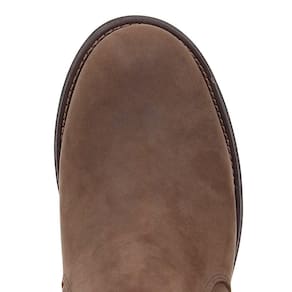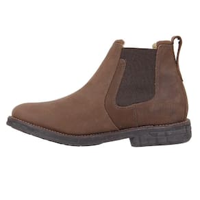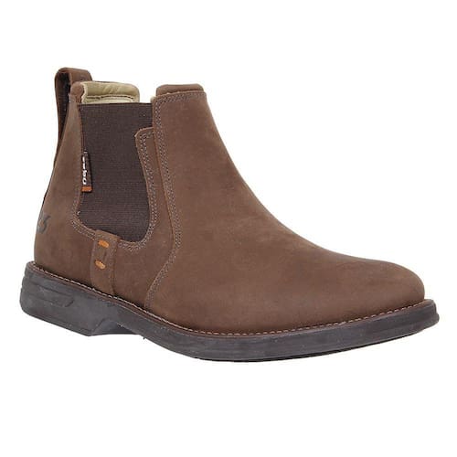 Botina masculina Zebu fabricada em couro na cor Marrom, possui cano curto com elásticos laterais, bico redondo, vira costurada e solado de borracha