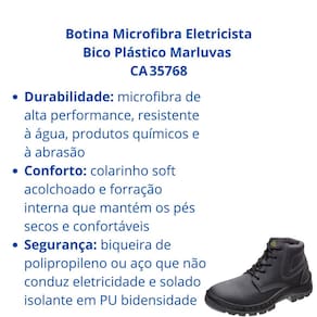 Botina Microfibra Eletricista Bico Plástico Marluvas CA?35768 Proteção, Conforto e Durabilidade para Profissionais A botina em microfibra preta oferece proteção elétrica em instalações de baixa tensão e segurança mecânica contra quedas de objetos. Seu colarinho e lingueta soft acolchoados, forração interna respirável e fechamento em cadarço garantem conforto e ajuste preciso, enquanto a biqueira de polipropileno ultrarresistente e o solado isolante em PU bidensidade protegem contra impactos e choques.