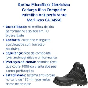 Adquira agora sua Botina Microfibra Eletricista Cadarço Bico Composite Palmilha Antiperfurante Marluvas CA 34550 e garanta proteção, conforto e durabilidade no trabalho!