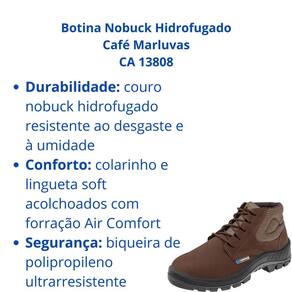 Botina Nobuck Hidrofugado Café Marluvas CA 13808 Proteção, Conforto e Durabilidade para Profissionais A Botina Nobuck Hidrofugado Café Marluvas foi desenvolvida para oferecer segurança, conforto e durabilidade em diversas atividades. Seu cabedal em couro nobuck hidrofugado mantém os pés secos e com temperatura equilibrada, enquanto a biqueira de polipropileno garante proteção contra impactos leves.