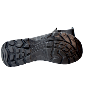 Solado: Constituído de duas camadas de poliuretano (PU), injetado diretamente no cabedal, sendo a 1ª camada (entressola) mais macia e leve, com densidade de 0,4g/cm³ proporcionando maior conforto; e 2ª camada (sola) mais compacta com densidade de 0,9 g/cm³, resistente a abrasão com sistema antiderrapante constituído de ranhuras especiais de 3mm de altura e 6mm de largura.Bico: PVC