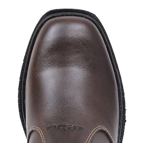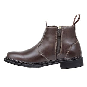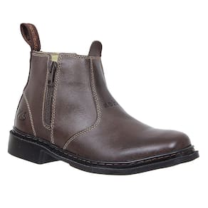 Botina unissex Zebu fabricada em couro na cor Marrom, possui cano curto com zíperes laterais, bico quadrado, vira costurada e solado de borracha