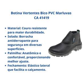 Especificações técnicas - Material: Couro resistente para maior durabilidade. - Solado: Borracha antiderrapante para segurança em diversas superfícies. - Palmilha: Anatômica e confortável, proporcionando melhor ajuste. - Fechamento: Elástico lateral que facilita o calçamento. - Certificação: CA 41419.