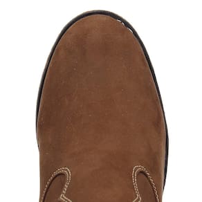Botina masculina Zebu modelo Vira Francesa fabricada em couro na cor Marrom, possui cano curto com elásticos laterais, bico redondo, vira costurada e solado de borracha.
